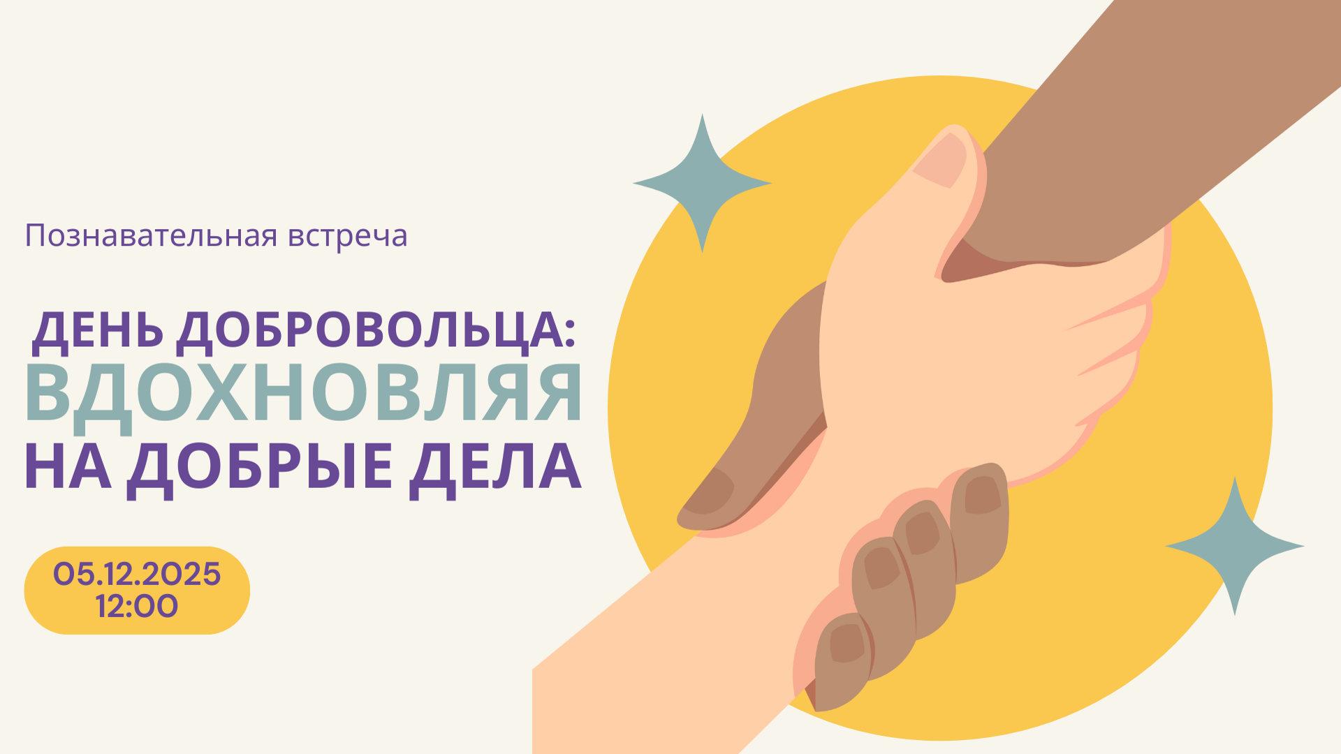 Всемирный День добровольца – особый праздник, посвящённый людям, которые своим временем и усилиями делают мир лучше. На нашем мероприятии участники смогут узнать об истории праздника и значении добровольческой деятельности, обсудить современные добровольческие проекты, реализуемые в нашей стране.